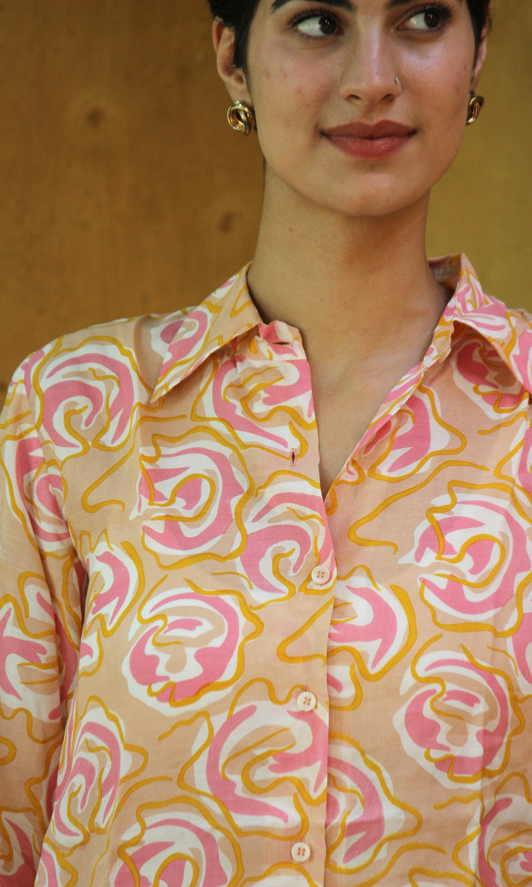 This 2-piece coord set includes a front ruffle shirt and A-line shorts, featuring a vibrant abstract multicolour iris screen print — perfect for a beachy vacation.